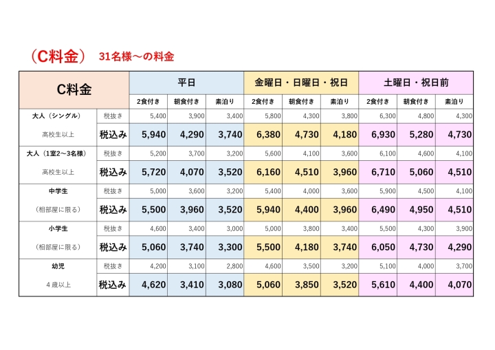 お正月、お盆の期間中は素泊り(土曜・祝日料金)のみの受付けになります。